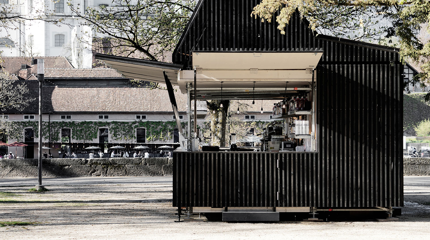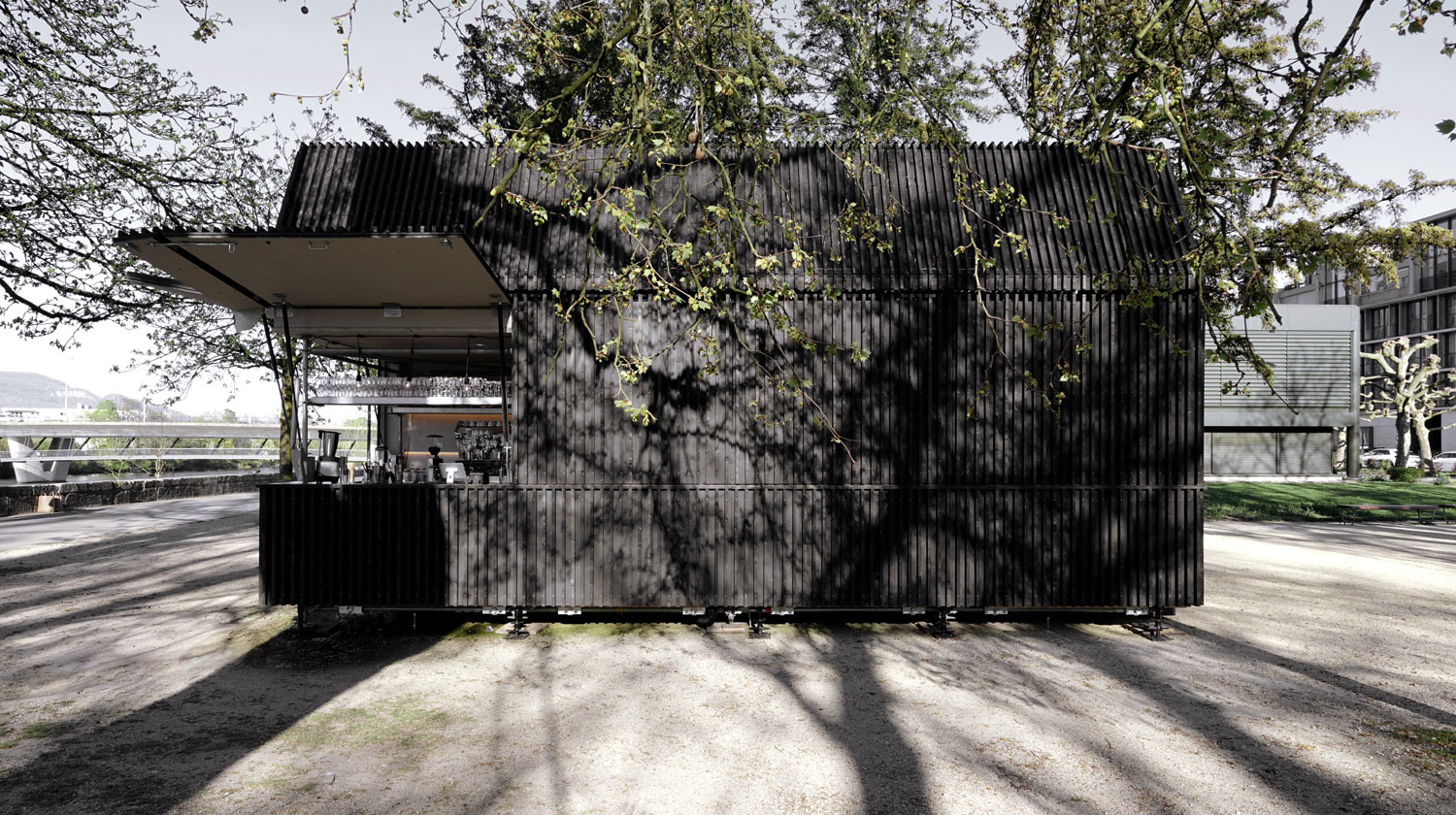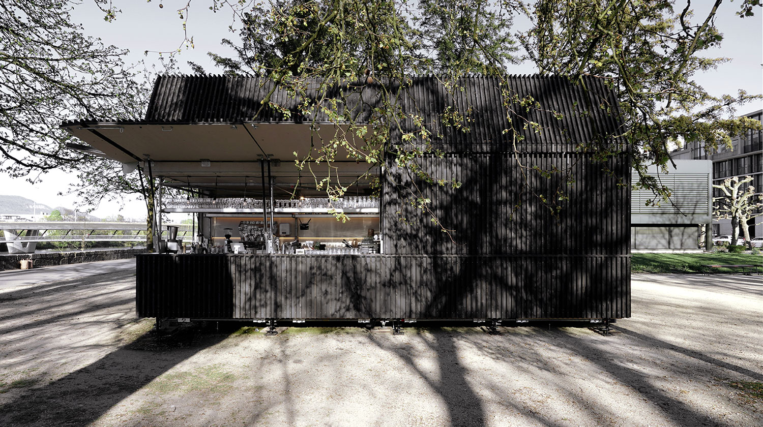 The architectural configuration supports varying intensities of use: a linear counter enables both quick consumption in the sense of an “espresso al banco” for commuters and longer stays in the outdoor seating area. The arrangement of furniture maximizes visual connections to the Aare while integrating existing qualities such as mature trees and natural shading.