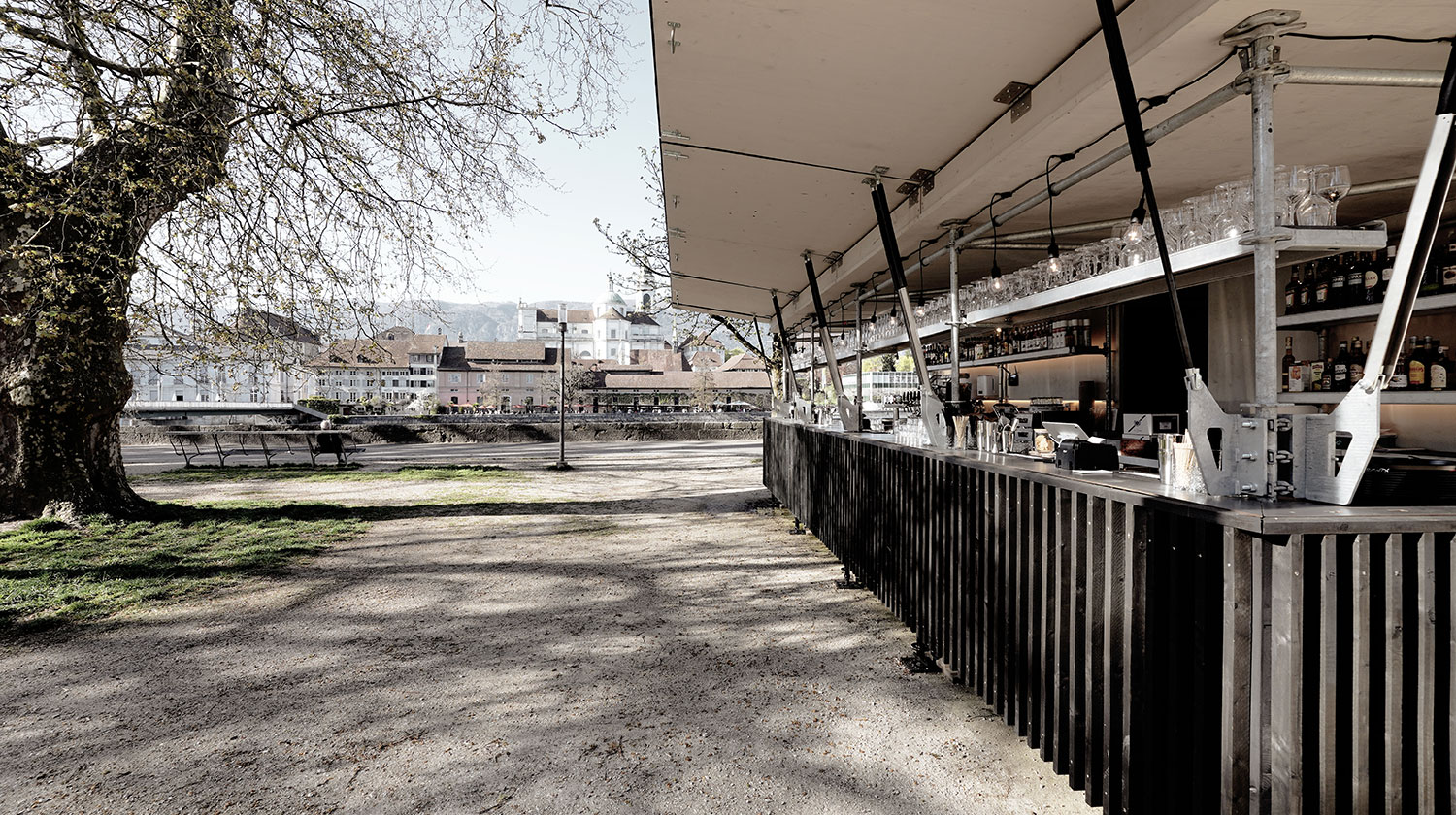 The “volAare” buvette is conceived as a temporary, easily demountable intervention at Kreuzackerplatz in Solothurn, contributing architecturally to the activation and enhancement of the public realm. Located in immediate proximity to the Aare River and with views of St. Ursus Cathedral, it functions as a low-threshold meeting point and reinforces the spatial linkage between the railway station, the historic old town, and the riverfront.