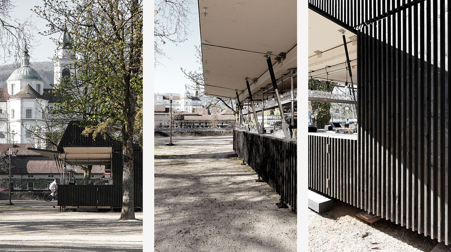 Die Buvette „volAare“ ist als temporäre, leicht rückbaubare Intervention am Kreuzackerplatz in Solothurn konzipiert, die architektonisch zur Aktivierung und Aufwertung des öffentlichen Raums beiträgt. In unmittelbarer Nähe zur Aare und mit Blick auf die St. Ursen-Kathedrale fungiert sie als niederschwelliger Treffpunkt und stärkt die räumliche Verknüpfung zwischen Bahnhof, Altstadt und Flussufer.